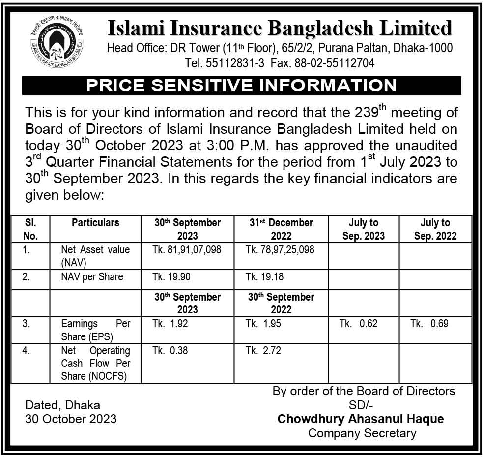 PRICE SENSITIVE INFORMATION (3rd QTR) || 30 October, 2023